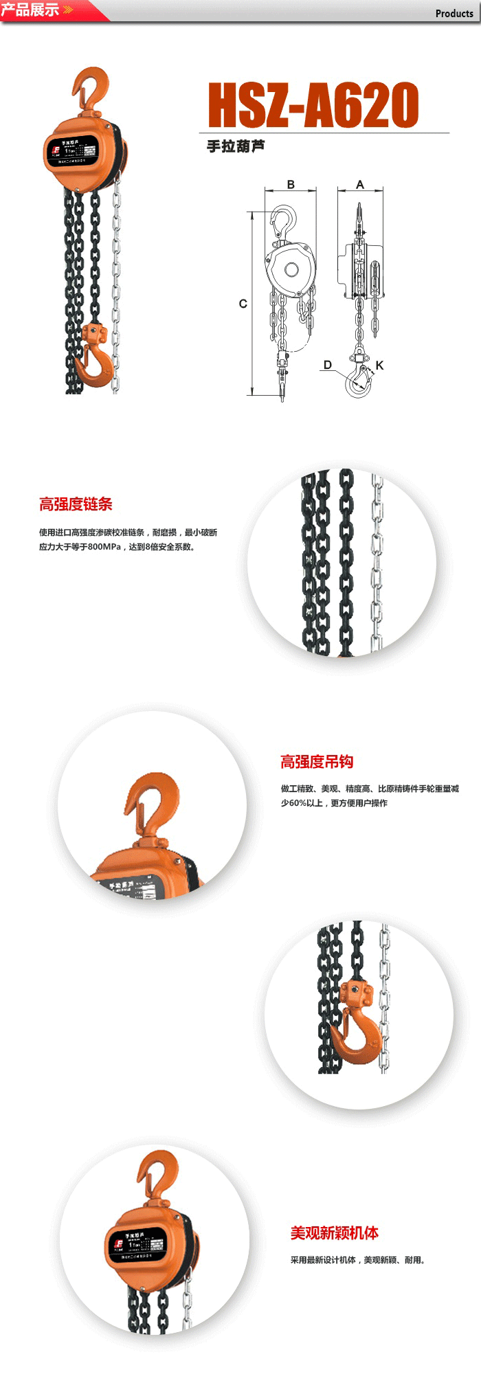 HSZ-A620型手拉葫蘆根據(jù)產(chǎn)品安全設(shè)計(jì)標(biāo)準(zhǔn)生產(chǎn),產(chǎn)品安全性、可靠性都得到了保障。 產(chǎn)品具有以下特點(diǎn): 1、安全可靠,外殼選用低合金鋼結(jié)構(gòu),在保證美觀的同時(shí)還能保證安全; 2、使用壽命長(zhǎng),起重鏈條選用800Mpa級(jí)鏈條,有效增加了產(chǎn)品的使用年限; 3、運(yùn)行順利,機(jī)體內(nèi)部結(jié)構(gòu)布局合理,導(dǎo)鏈輪制作精密,能夠保證拽動(dòng)手拉鏈條正常運(yùn)轉(zhuǎn); 4、制動(dòng)安全,采用雙棘輪制動(dòng),能夠有效的保證制動(dòng)的安全; 5、結(jié)構(gòu)合理,整體結(jié)構(gòu)緊湊,體積小、重量輕; 6、堅(jiān)固耐磨,葫蘆外殼選用優(yōu)質(zhì)合金鋼進(jìn)行制作,有效提高產(chǎn)品的使用壽命。 產(chǎn)品應(yīng)用廣泛,在農(nóng)業(yè)、電力、工廠、建筑、倉(cāng)庫(kù)等地可以用來(lái)安裝設(shè)備、裝卸車(chē)輛、吊運(yùn)貨物等。 |